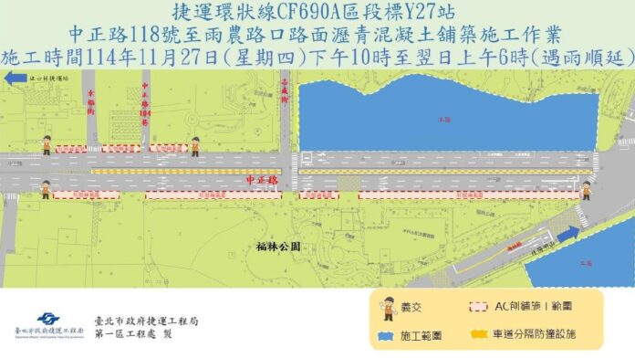 環狀線北環段CF690A標工程預定114年11月27日夜間進行臺北市士林區中正路118號至雨農路面瀝青混凝土鋪築施工作業