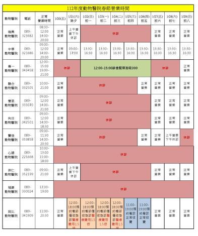 中華動物醫院1/20正常營業、除夕營業到17:00,1/22-1/29每天13:30-16:30營業;專一動物醫院於1/20-21及1/27-28休診,1/22-1/26及1/29為12:00-15:00營業;班比動物醫院於1/20正常營業,除夕至初五12:00-18:00採預約看診。為避免動物醫院臨時調整營業時間,或就診動物過多等候時間過長,飼主可提前電話詢問各醫院。