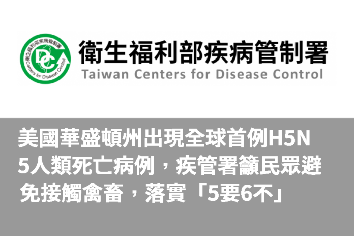 美國華盛頓州出現全球首例H5N5人類死亡病例,疾管署籲民眾避免接觸禽畜,落實「5要6不」