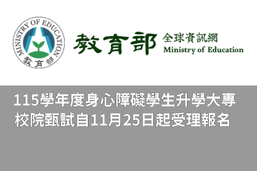 115學年度「身心障礙學生升學大專校院甄試」(以下簡稱本甄試)將於115年3月20日至3月23日舉行。報名作業自114年11月25日至12月8日止,其中個別報名考生報名期間為12月2日至12月8日,請考生留意報名及繳費截止時間,以免影響應試權益。