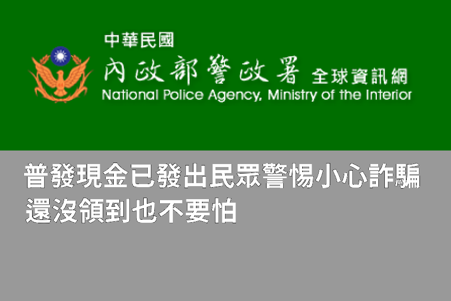 普發現金於11月初完成登記,並自11月12日起陸續發放,刑事局提醒民眾,11月17日起亦開放ATM領取及11月24日開放郵局領現,每個人都領得到,如發現尚未收到,請耐心等候或洽銀行、財政部等正當官方管道查詢,勿輕信聲稱金融機構或檢警單位的不明訊息,檢警單位也不會以LINE傳送公文書或視訊制作筆錄,請民眾多加留意,避免落入詐騙集團陷阱 刑事警察局也再三強調,政府不會以「簡訊通知」、「電子郵件」等方式要求民眾登錄個資,也不會透過電話要求操作ATM或網銀,且正確的政府網站網址均以「 .gov.tw 」結尾,且「gov」前方必為「.」,不會夾雜英文字母、數字或符號。若收到可疑訊息、網站或來電,應立即撥打165反詐騙專線查證,或撥打110報案。