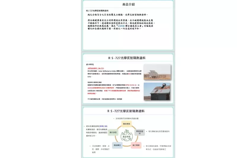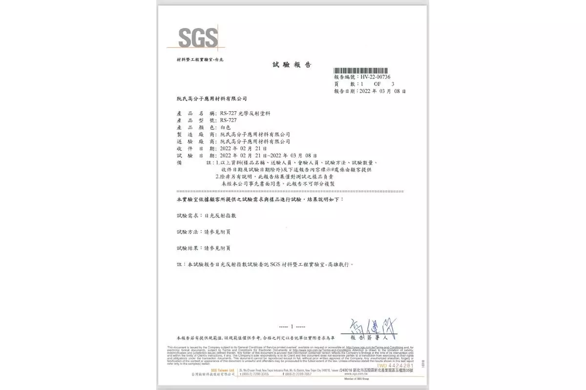 RS-727的主要特點是其產品經SGS測試高達93%的日光反射指數(SRI值),這意味著在夏季可顯著降低建築物表面升溫,從而減少空調能耗;並通過2000小時的加速老化耐候性測試,展現出優異的抗紫外線照射和長效耐用性,不僅提供隔熱效果,還能為建築物表面提供額外的耐候保護。
