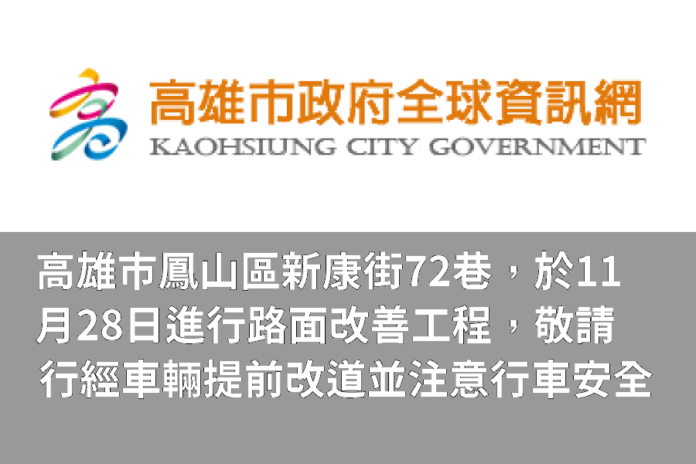 為改善高雄市道路通行品質,工務局道路養護工程處將於11月28日進行本市鳳山區新康街72巷(新康街~新康街72巷底)路面改善工程。施工時段為上午8時至夜間24時。另為顧及工程品質,刨鋪後均依施工規範封閉養護6小時以上或溫度降低至50℃以下始開放通車,確保道路使用壽命及品質,如遇天候不佳,將順延一天進場施工,另因氣候或不可抗力造成之施工障礙,得隨時調整施工日期,並以現場施工公告為主。