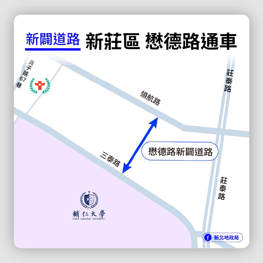 經常往返輔仁大學附近、新莊副都心及機捷泰山站周邊的用路人請留意,塭仔圳第一區兩條新闢道路將於11月27日上午10時正式通車!開放通行的道路包含鄰近輔大醫院的「懋德路」,可串聯領航路與三泰路,以及靠近機捷泰山站的「環泰二路」則銜接泰林路與中環路,通車後將有效提升主要幹道間的銜接效率,強化區域整體路網連結,讓塭仔圳第一區及周邊地區的交通更加順暢。