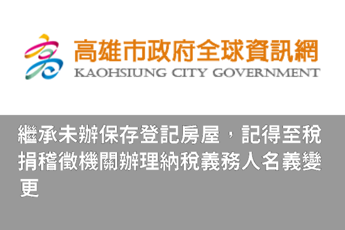 高雄市稅捐稽徵處提醒民眾,民眾辦理房屋繼承案件時,如為已登記建物,應至地政事務所辦理繼承事宜;如為未辦保存登記之建物,則應向稅捐稽徵機關申報房屋稅納稅義務人名義變更。