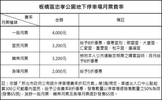 交通局表示,忠孝公園地下停車場將自今晚18時起試營運至12月24日止,開放免費停車,12月25日起正式收費營運。臨停費率汽車每小時30元、機車每次20元;同時有汽車月票130張、每張4,000元,機車月票16張、每張300元,月票抽籤辦法詳見附表並另已公告於交通局網站,歡迎有停車需求的市民朋友多加利用。