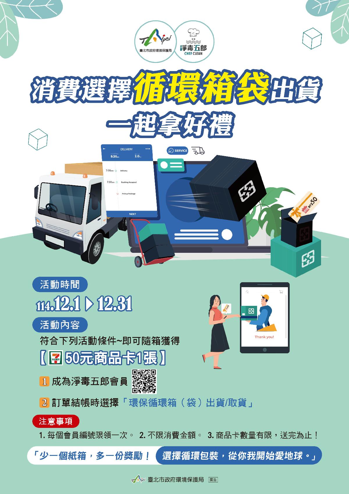 為推動綠色消費與資源循環利用,臺北市環保局攜手淨毒五郎電商平台推出「循環配送・綠色獎勵」活動,自114年12月1日至12月31日止,民眾只要成為淨毒五郎會員,並於訂單結帳時選擇使用「環保循環箱(袋)出貨/取貨」,即可隨箱獲得統一超商商品卡50元1張,每個會員編號限領1次(不限消費金額,數量有限,送完為止),透過實際行動支持綠色生活。
