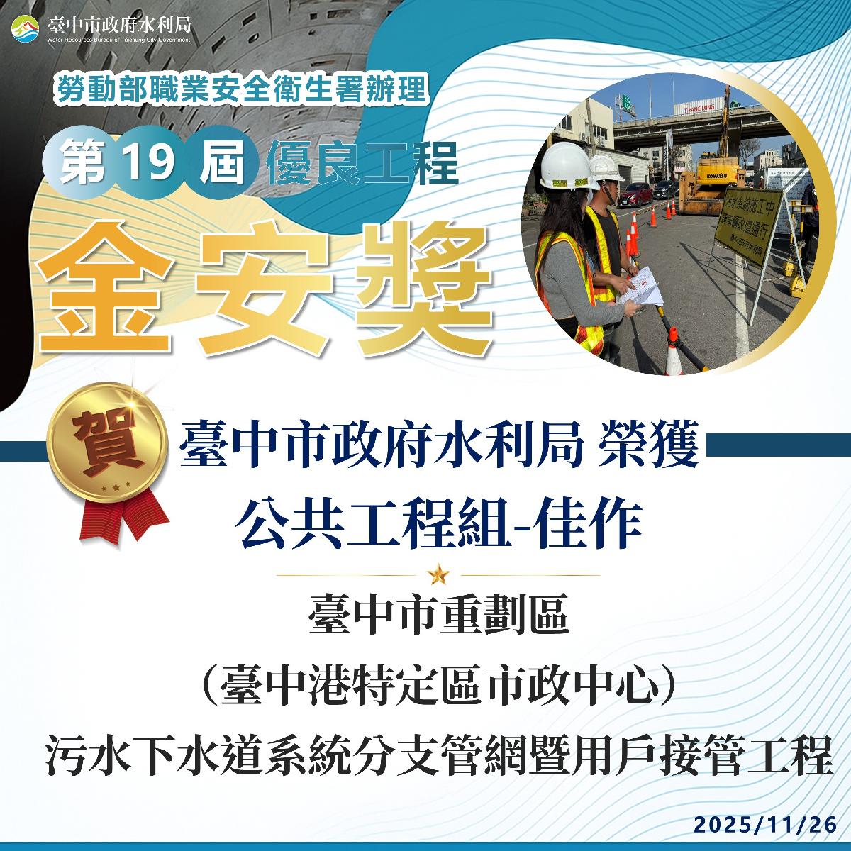 2025年「第19屆優良工程金安獎」頒獎典禮昨(26)日隆重舉行,台中市政府水利局以「台中市重劃區(台中港特定區市鎮中心)污水下水道系統分支管網暨用戶接管工程」,榮獲「推動職業安全衛生優良工程金安獎」公共工程類佳作肯定,展現水利局長期深耕工程職業安全衛生的成果。