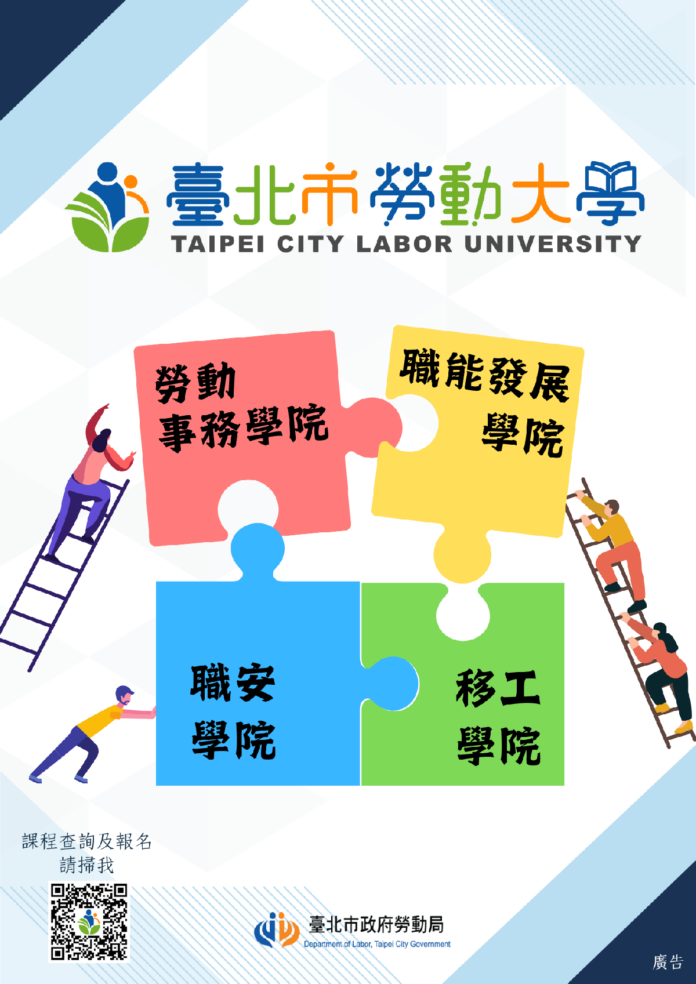 歡迎所有關心自身勞動權益、想提升職場安全與專業技能的民眾,多加利用「臺北市勞動大學」免費的線上影音資源,一起增進職場新實力!如想要更了解「臺北市勞動大學」,可逕至官方網站查詢、勞動局官網(路徑:首頁/主題網站/臺北市勞動大學),或電洽02-27208889分機3344;如有課程相關問題,可洽各學院窗口(勞動事務學院/02-27208889分機3345、職安學院/02-23086101分機501、職能發展學院/02-28721940分機9,以及移工學院/02-23381600分機4211、4212、4202)。