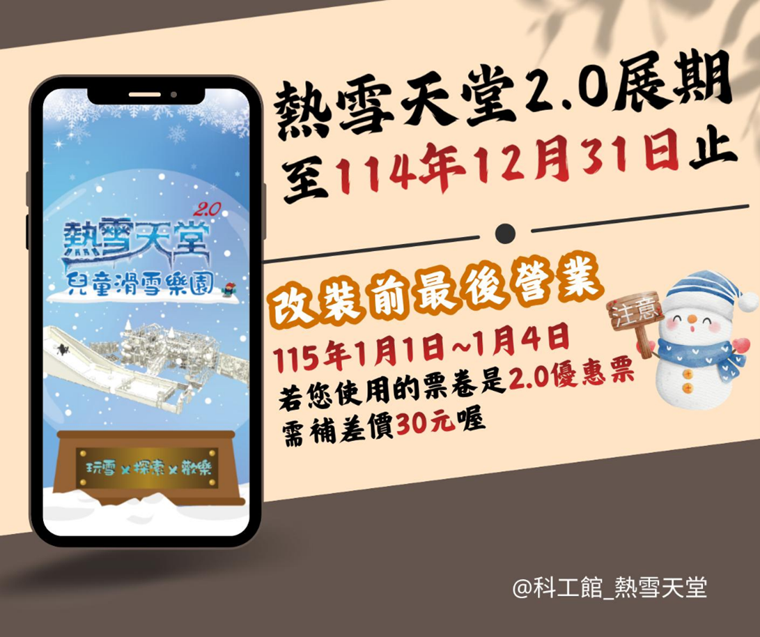 感謝您熱烈參與「熱雪天堂兒童滑雪樂園2.0特展」!以下為您提醒重要資訊: