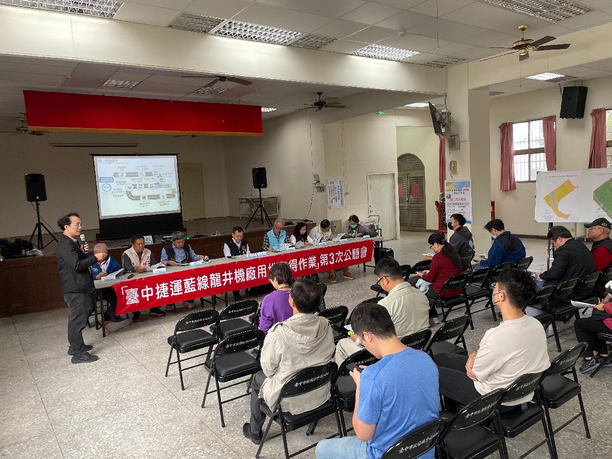 台中市政府捷運工程局今(27)日在龍井區新庄里活動中心舉辦「台中捷運藍線龍井機廠用地取得」第三場公聽會,向土地所有權人說明計畫內容並蒐集意見,確保用地取得程序公開透明,兼顧地方發展與民眾權益。