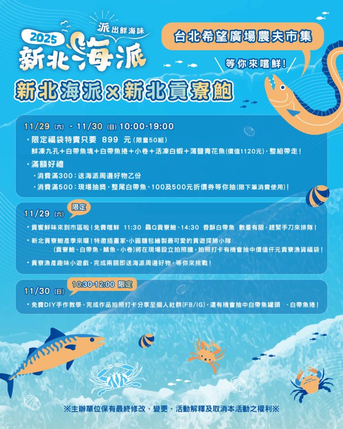 新北海派活動巡迴最終站在台北市希望廣場舉行,同時為貢寮鮑產季揭開序幕,為了讓民眾品嚐美味貢寮鮑,貢寮區漁會於11月29日、11月30日、12月13日、12月14日在台北市希望廣場農民市集舉辦「貢寮鮑搶鱻展售活動」,將貢寮在地最鮮甜漁貨帶至市區。為歡慶活動開幕,11月29日現場邀請貢寮當地家政媽媽,進行貢寮鮑料理示範教學,並在於上午11點30分發放鮮烤貢寮鮑限量100份免費試吃,下午14點30分還有酥炸白帶魚100份。11月30日活動則有貢寮鮑手作坊,限量20人,可以親自動手改造貢寮鮑殼,發揮創意將貢寮鮑殼製作成擺件。11月29及30日的展售活動還有限量福袋特賣,價值1120元的海鮮禮盒,內容有鮮凍九孔、白帶魚塊、白帶魚捲、小卷、活凍白蝦及薄鹽鯖魚,只要899元!另外單筆滿500元即可現場抽獎,有機會白帶魚整尾帶回家,最大獎還有現金折價券500元(限下次消費使用),多種好康千萬不能錯過!活動現場還推出「貢寮鮮境探索指南」,讓民眾之後到貢寮遊玩可以按圖索驥品嚐美味貢寮鮑料理及購買生鮮魚貨。