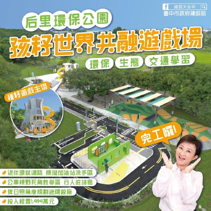 「后里環保公園」是后里區重要的綠地與市民休憩場域,為強化公園的多元功能,台中市政府投入1,584萬元打造全新的「孩籽世界遊戲場」,今(27)日正式啟用,由建設局長陳大田與秘書處長謝佳蓁代表市長盧秀燕出席啟用儀式,為后里再增添一處兼具教育與娛樂的親子新亮點;遊戲場以「環保」、「生態」與「交通學習」三大主題為核心,打造寓教於樂、充滿創意的遊戲環境;活動中,陳局長也宣布后里環保公園即將迎來新成員「黑天鵝」,消息一出讓小朋友驚喜不已,也展現市府持續推動友善親子空間的用心與決心。