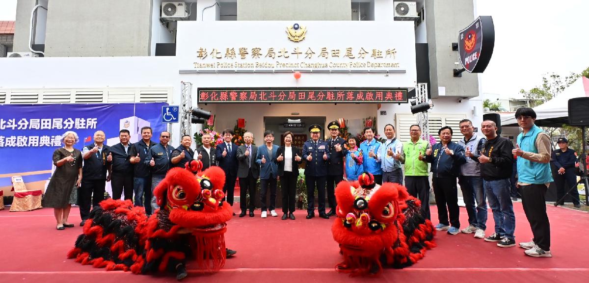 彰化縣警察局北斗分局田尾分駐所新建辦公廳舍落成典禮,今(27)日上午由縣長王惠美主持揭牌儀式,議長謝典霖及議員等地方民代共同剪綵。王縣長表示,由於田尾鄉蓬勃發展,人口成長迅速,原有分駐所已不敷民眾需求,新建田尾分駐所規劃進駐警力16名,興建經費新臺幣4,853萬4,000元,為總建坪223坪的地上3層建築,格局方正,採開放式設計結合公園休憩功能,整體洽公環境優雅,啟用以後將能為在地鄉民提供完善警政服務,強化地區執勤效能。