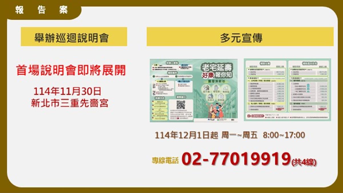 內政部最後強調,政府將持續致力消弭危險建築物並務實解決臺灣「人屋雙老」問題,都市更新政策推動須兼顧公共利益、社會責任與各方權益。除持續推動公辦與民辦都市更新外,內政部亦依據賴清德總統指示積極研議自主都更相關方案,包括財務與專業協助,並加強與社會各界溝通。另將於11月30日在新北市三重區先嗇宮啟動老宅延壽首場巡迴說明會,期盼透過面對面說明方式,讓民眾瞭解政府提供之居住修繕資源與協助,共同打造更安全、宜居與永續的城市環境。