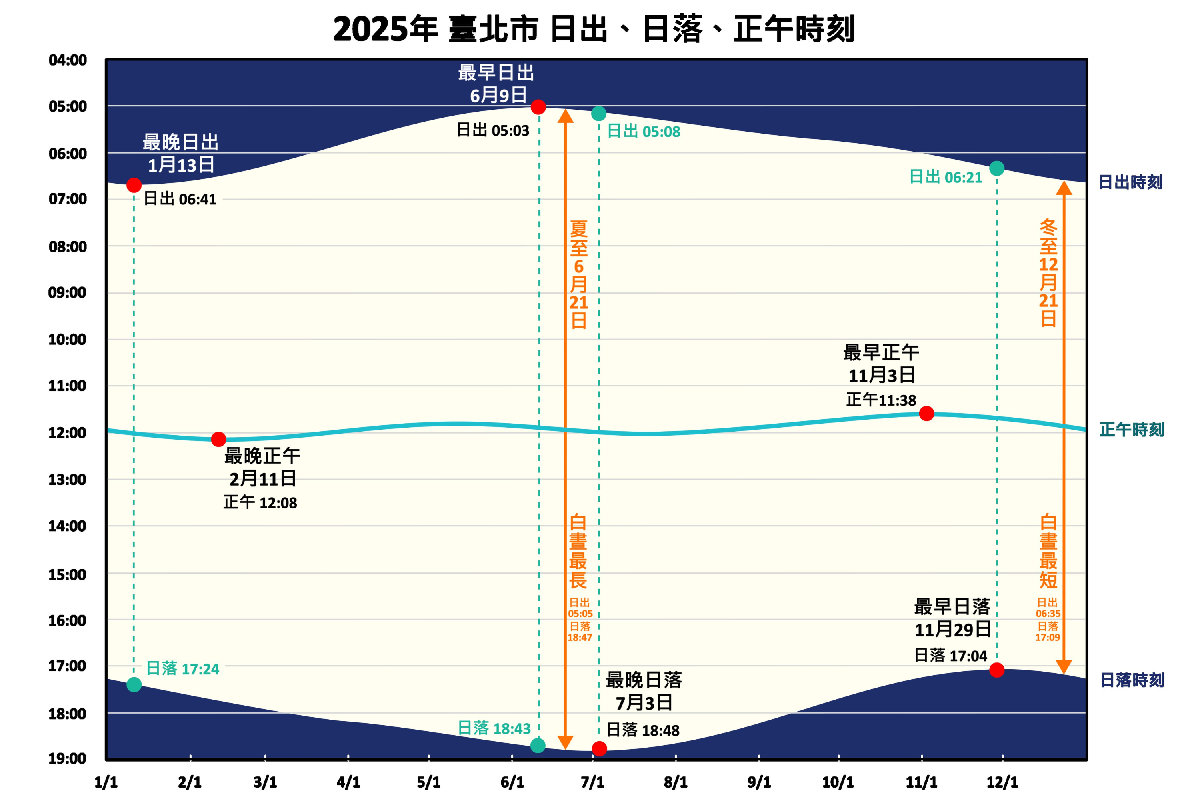 一年中夜晚最長、白晝最短的是冬至(12月21日),但冬至並不是太陽最晚升起與最早落下的日子,這是由於地球運行的兩大特性,橢圓形的公轉軌道與地軸傾斜角共同作用的結果。臺灣最早日落通常出現於11月底至12月初,以今年為例,臺北市冬至的日落時間為17時9分,比本週還晚5分鐘。最晚日出也不是出現在冬至,而是在1月8日至1月19日間,太陽於6時41分才升起,比冬至的6時35分還晚6分鐘。