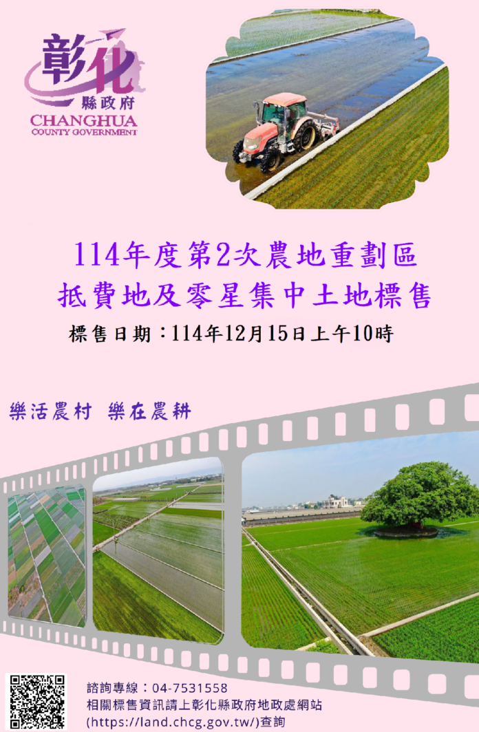 彰化縣政府訂於114年12月15日(星期一)上午10時辦理農地重劃區抵費地標售,此次標售土地分布於芳苑鄉、埔鹽鄉、福興鄉等11個鄉鎮,共計26筆,皆採現況標售,有興趣者可自行實地查勘(土地坐標詳本府地政處網站),了解土地現況、周邊環境,踴躍投標。
