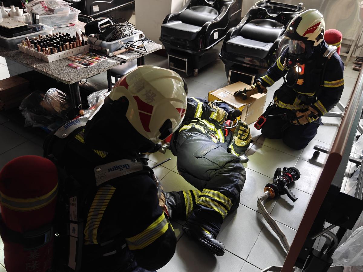 救災過程中特別強調「火場安全管制」的重要性。所有入室搜索的人員必須向安全幕僚報到,並確認個人防護設備穿戴完整、空氣瓶壓力須高於250 bar,救命器檢視是否確實開啟,並定時回報殘壓情形與位置,確保救災人員安全無虞。