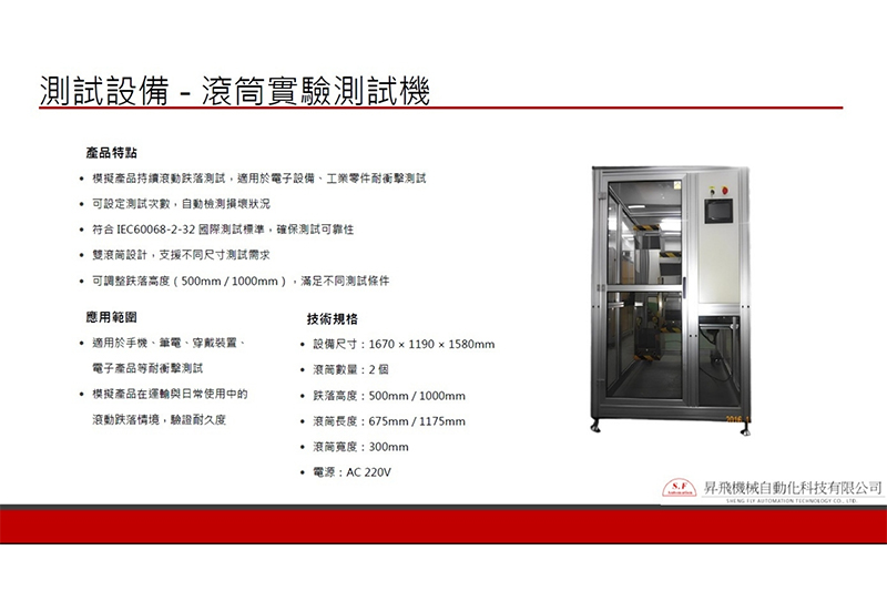 模擬產品持續滾動跌落測試,適用於電子設備、工業零件耐衝擊測試,可設定測試次數,自動檢測損壞狀況,符合 IEC60068-2-32 國際測試標準,確保測試可靠性,雙滾筒設計,支援不同尺寸測試需求,可調整跌落高度(500mm / 1000mm),滿足不同測試條件。