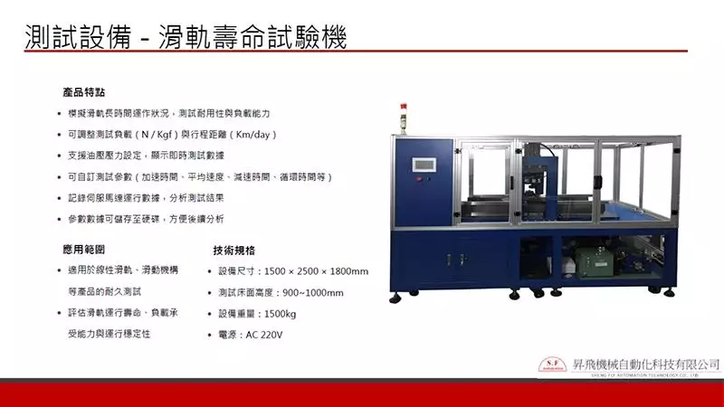 模擬滑軌長時間運作狀況,測試耐用性與負載能力,可調整測試負載(N / KgF)與行程距離(Km / Day),支援油壓壓力設定,顯示即時測試數據,可自訂測試參數(加速時間、平均速度、減速時間、循環時間等),記錄伺服馬達運行數據。