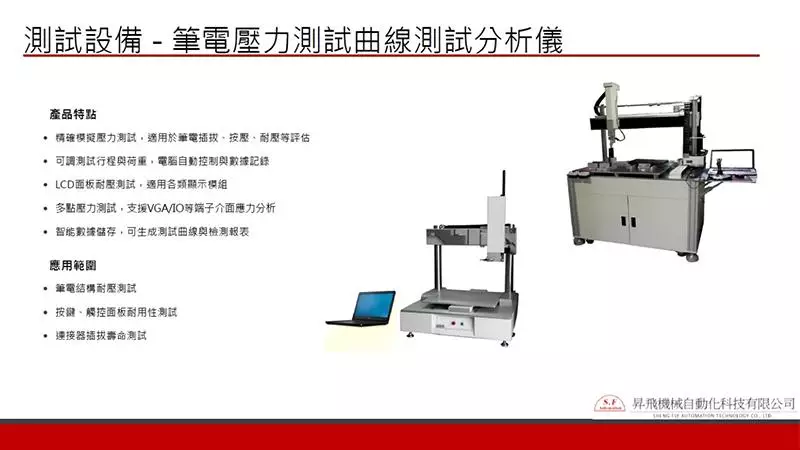 精確模擬壓力測試,適用於筆電插拔、按壓、耐壓等評估,可調測試行程與荷重,電腦自動控制與數據記錄,LCD面板耐壓測試,適用各類顯示模組