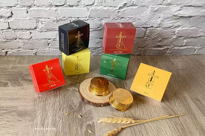 紅色基調搭配少量金粉,針對二胡的特性調整黏性與粉末,為飽滿的琴音中帶出華麗的亮點,是最值得推薦的二胡松香之一。