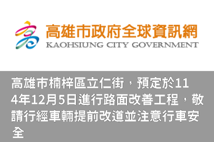 高雄市楠梓區立仁街,預定於114年12月5日進行路面改善工程,敬請行經車輛提前改道並注意行車安全