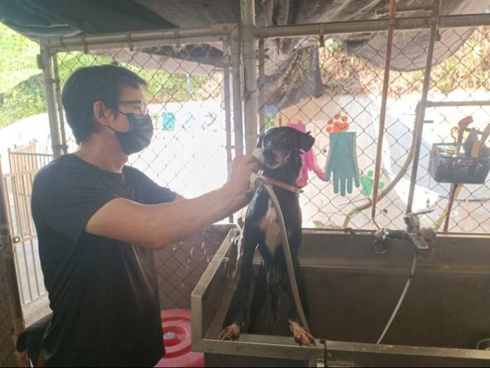 五股動物之家資深志工、同時也是行為訓練師的朱俊良,十多年來每逢假日必定報到,從牽行、訓練到洗澡,每一個步驟都仔細處理。他說,每隻狗都有不同個性,有的膽小、有的外向、有的則過度興奮,因此不管做什麼,他都會先觀察狗狗的呼吸、尾巴與肢體語言,再決定下一步訓練方式,他總是在互動前先伸手讓狗狗嗅聞,用牠們最熟悉、最安心的方式開始交流,再以柔和語氣、慢動作呈現友善姿態,避免造成壓力,他也會蹲低身體、側身而坐,減少壓迫感,讓狗狗感受到尊重與安全。