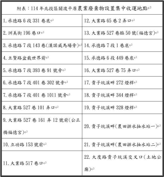 為服務農民朋友,環保局於北投關渡平原地區在二期稻作收割期間特設置22處集中收運點(詳如附表)協助免費收運,農友若有清運需求,可聯絡北投區清潔隊關渡分隊(02)2895-0256、士林區清潔隊社子分隊(02)2813-6658,協助送往焚化廠集中處理。