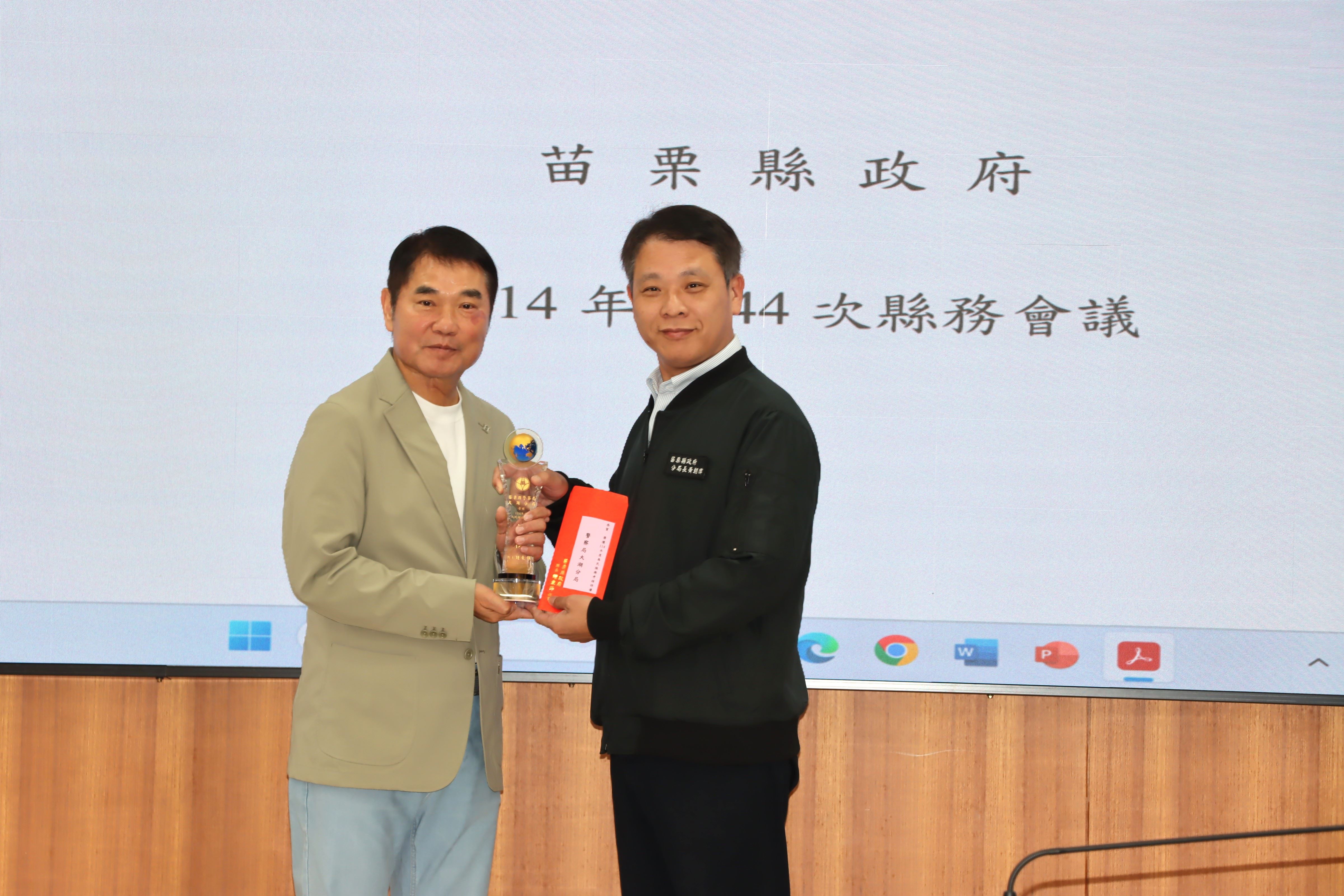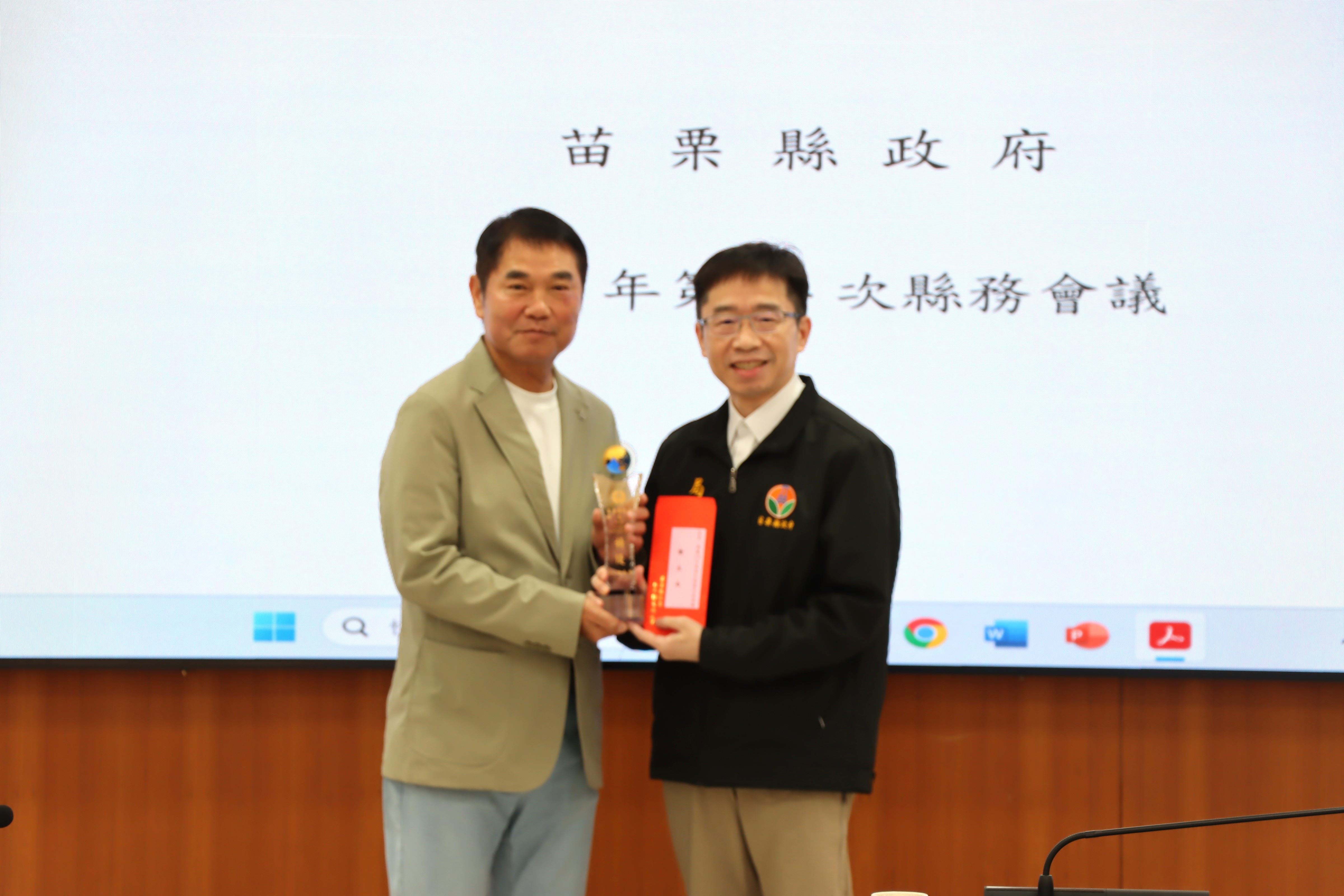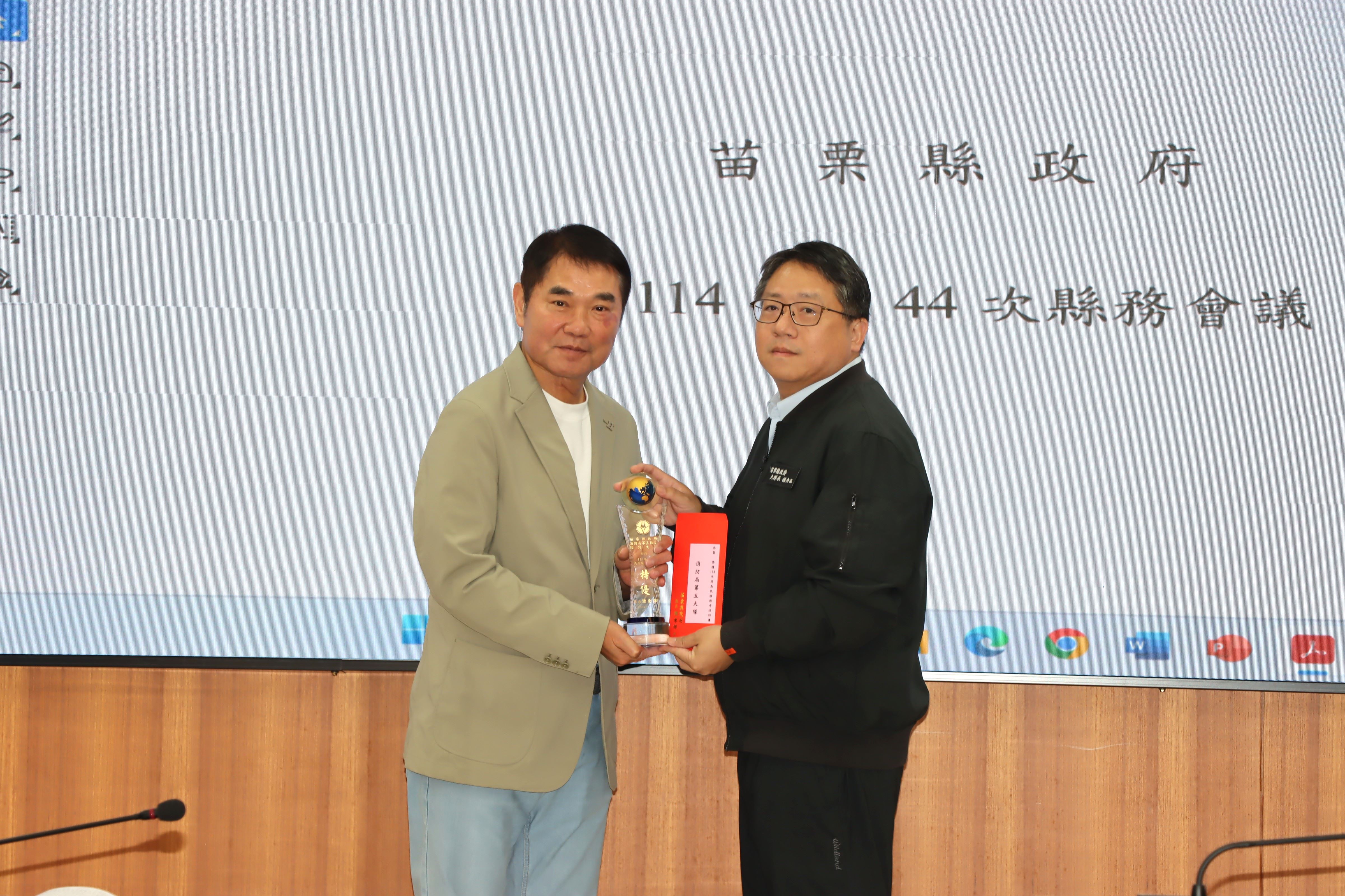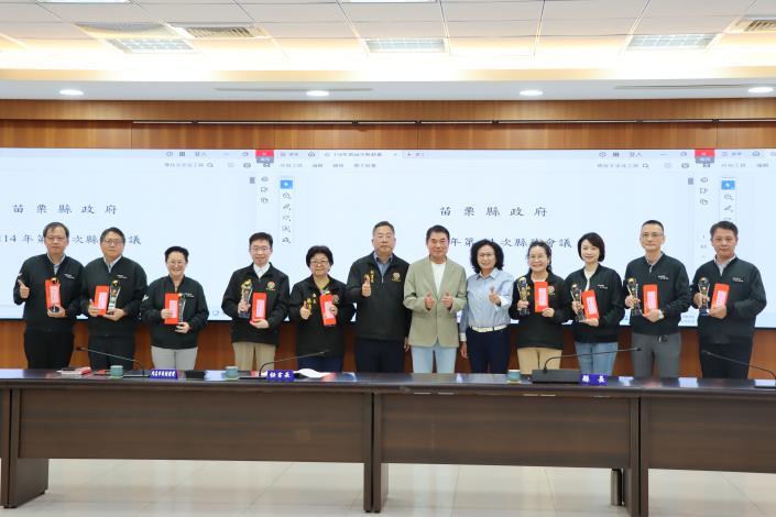 今天會中,縣長鍾東錦並頒獎表揚114年度為民服務考核榮獲特優的9個單位,頒發每個特優單位獎座及禮券8千元,獲獎單位包括人事處、稅務局、衛生局、三義戶政事務所、竹南地政事務所、銅鑼鄉衛生所、三義鄉衛生所、大湖警分局、消防局第5救災救護大隊。