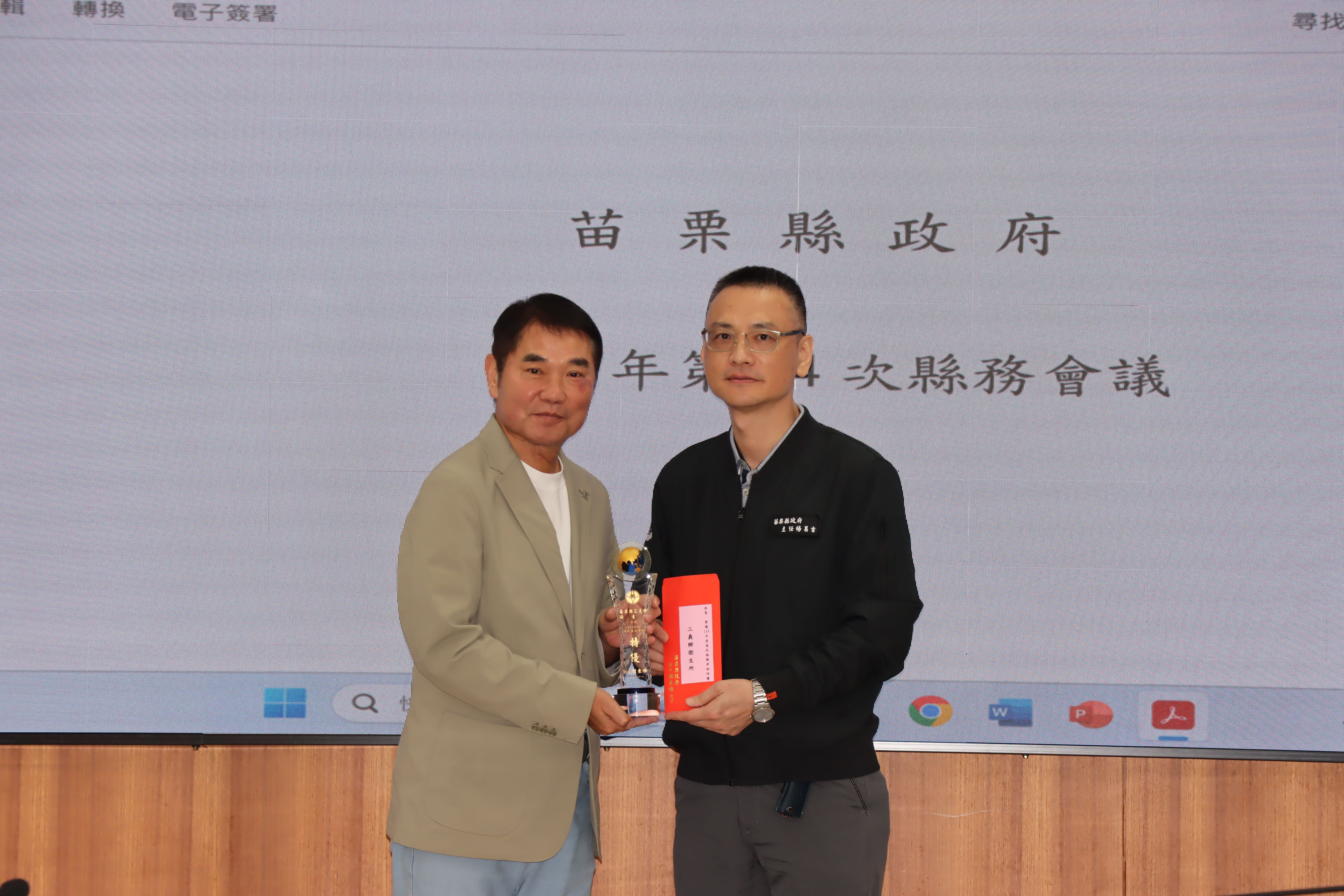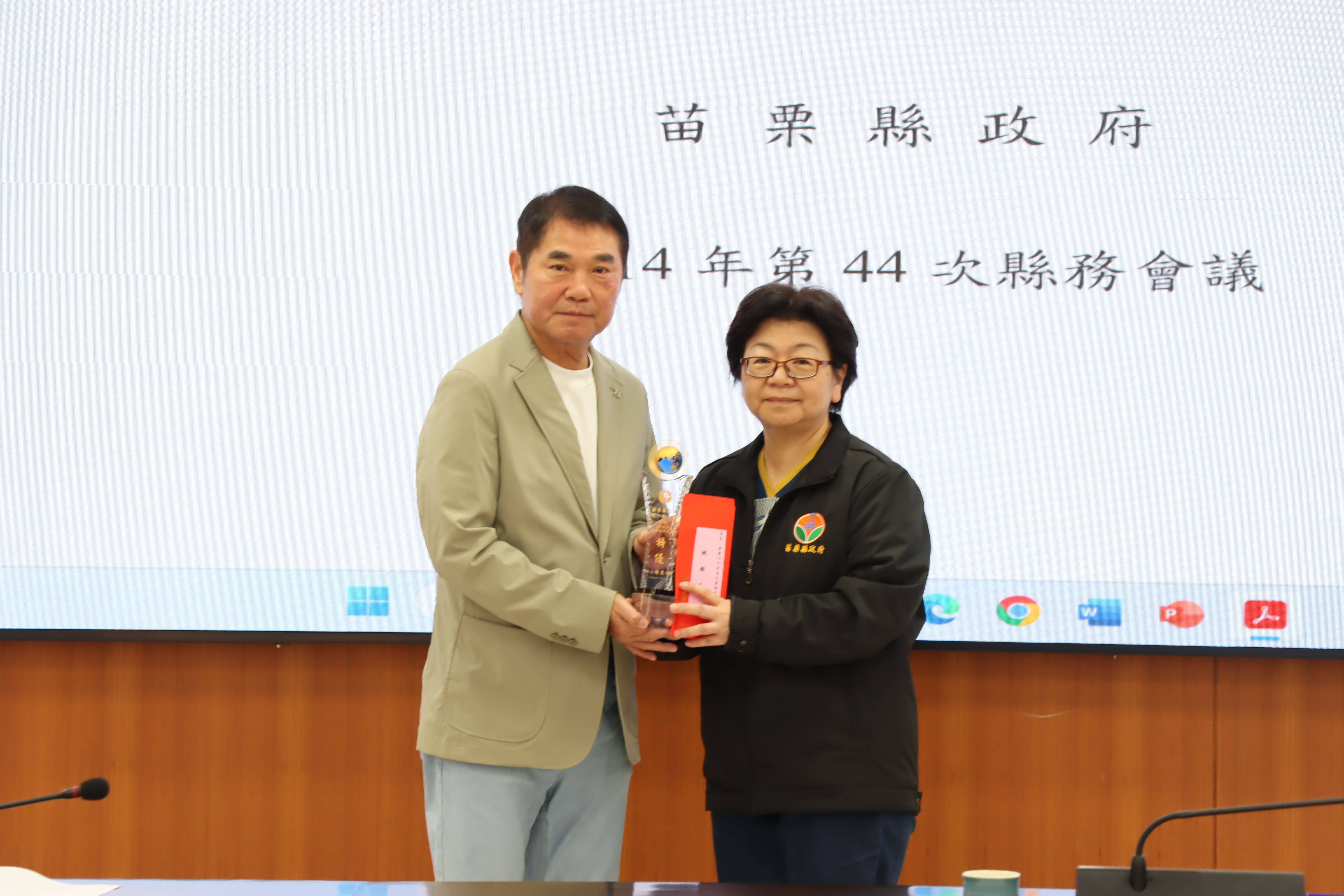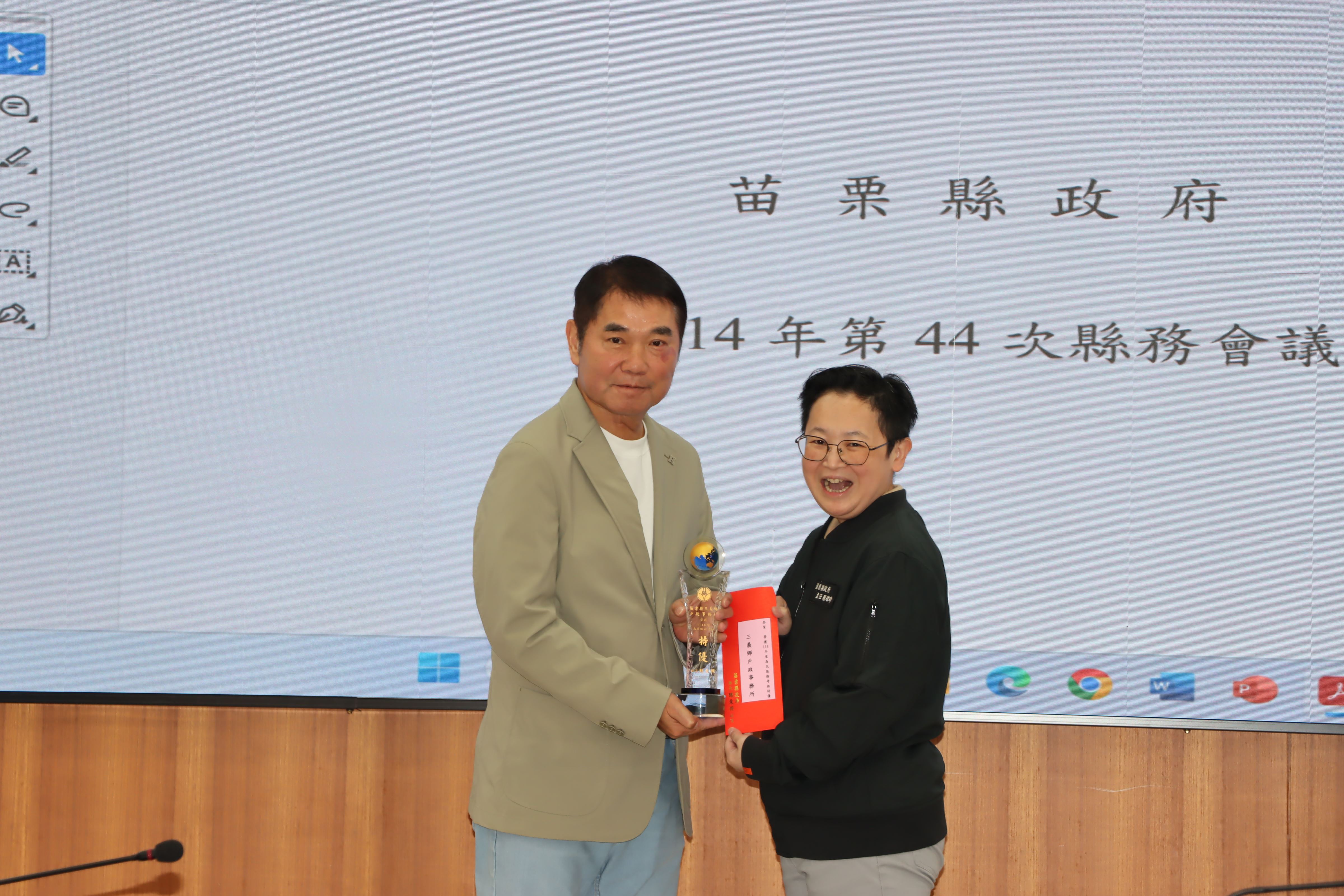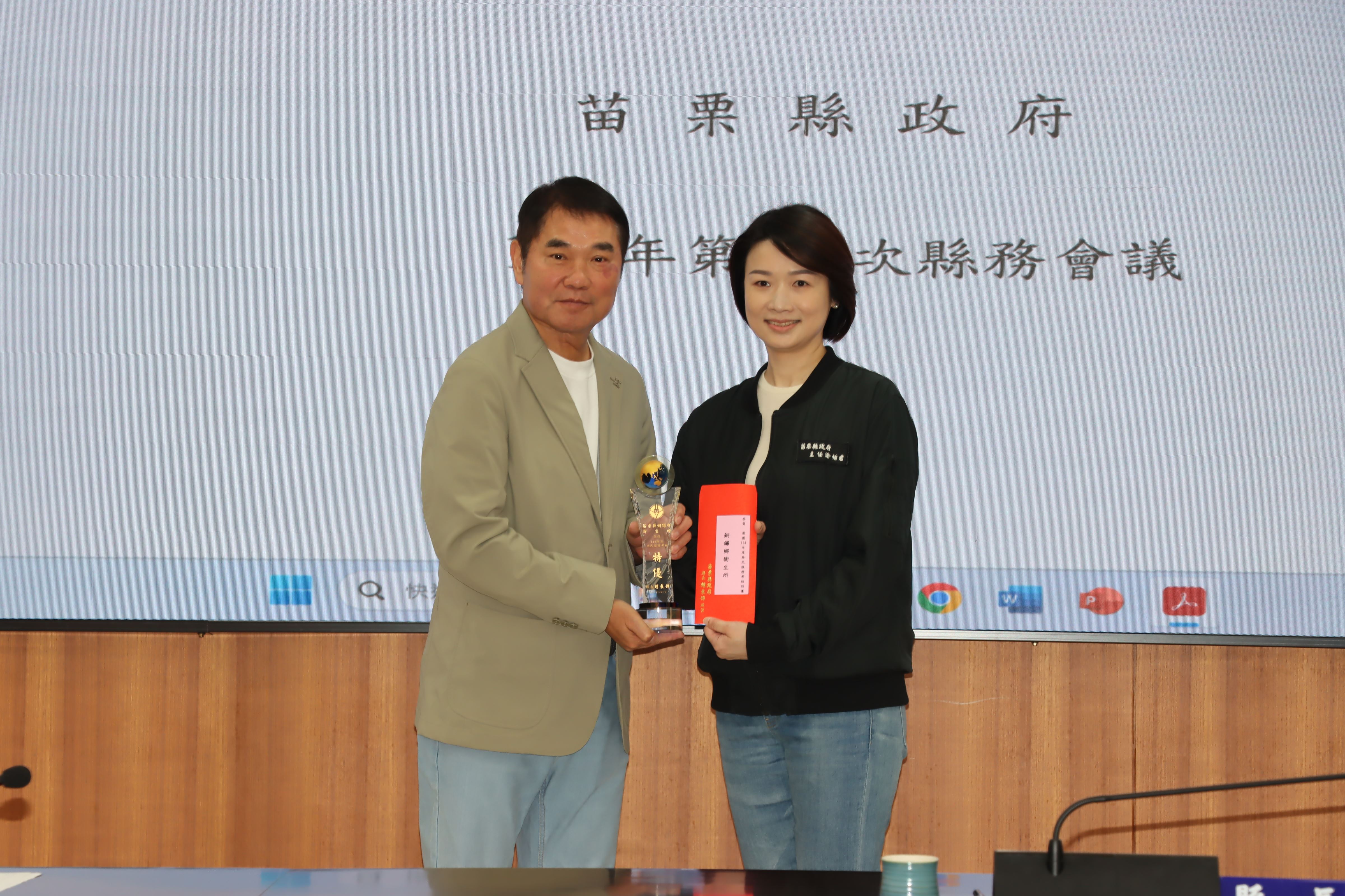 今天會中,縣長鍾東錦並頒獎表揚114年度為民服務考核榮獲特優的9個單位,頒發每個特優單位獎座及禮券8千元,獲獎單位包括人事處、稅務局、衛生局、三義戶政事務所、竹南地政事務所、銅鑼鄉衛生所、三義鄉衛生所、大湖警分局、消防局第5救災救護大隊。