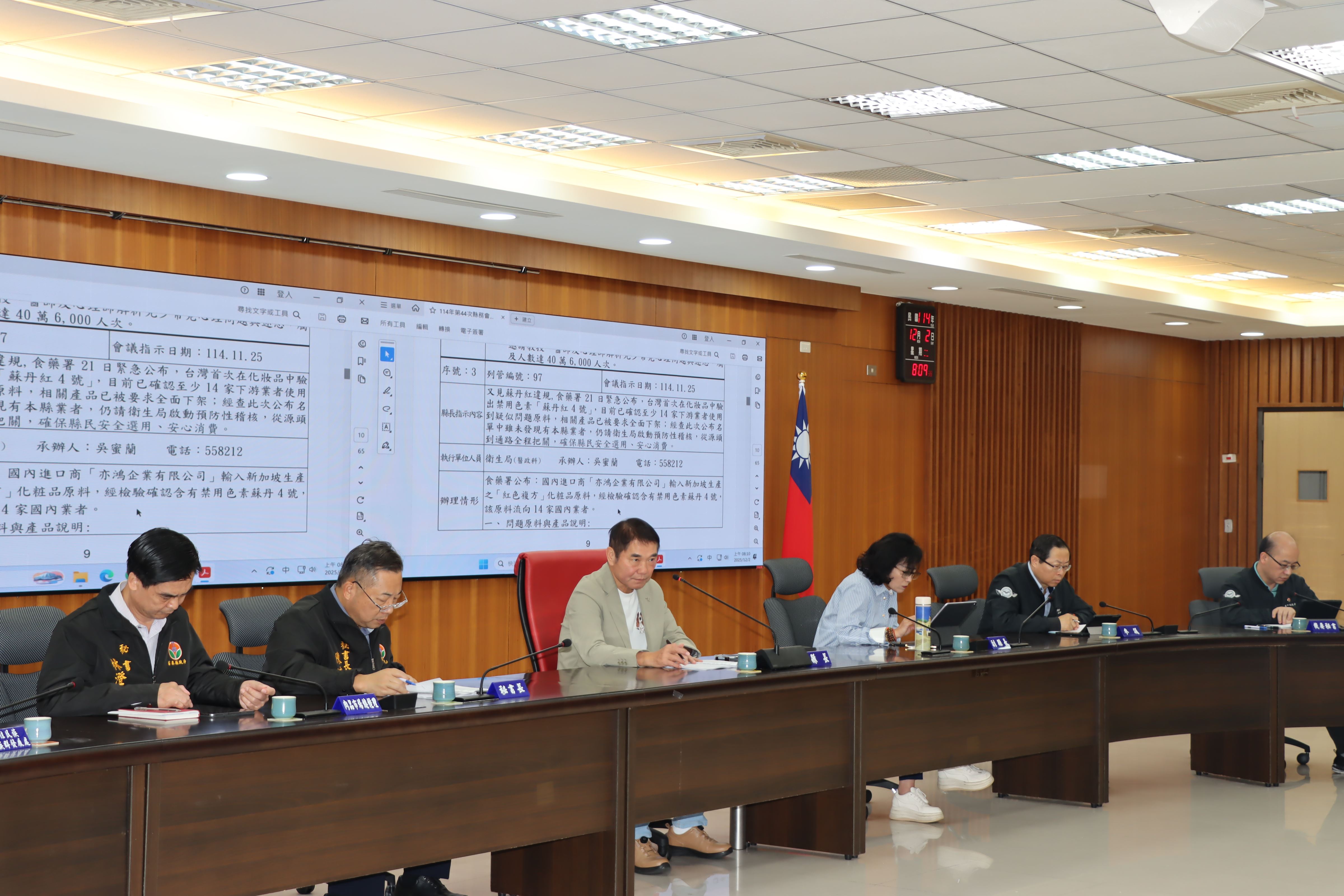 縣長鍾東錦12月2日在縣務會議中,頒發獎座、禮券表揚9個為民服務考核特優單位,同時要求消防、勞青、工商等局處借鏡香港宏福苑大火釀成嚴重災害事件,全面盤點查核高風險建築、外牆施工建材,並輔導業者加強工地管理及職安訓練,強化高樓救災應變能力及防災宣導,以最嚴謹的態度,全力保護縣民生命、財產安全。