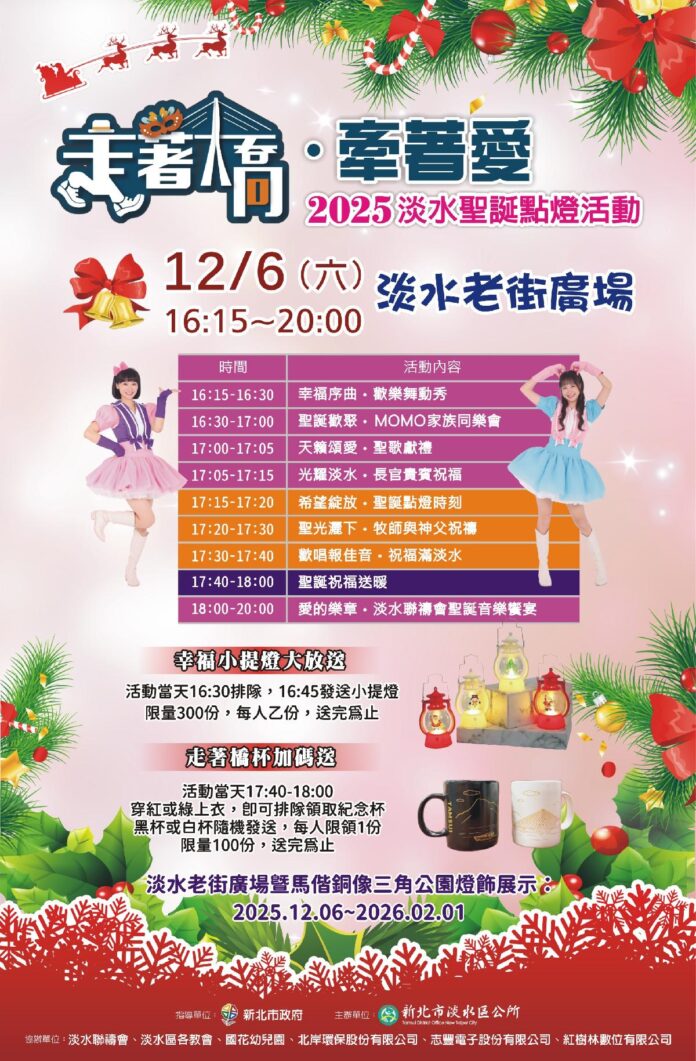 淡水區公所特別搶先公開聖誕點燈活動當天四大幸福好禮:「幸福小提燈300份、小天使甜蜜發糖、聖誕老公公派送禮物」,最後還有限定穿紅色或綠色上衣,依現場主持人指示排隊即可獲得加碼送「走著橋」紀念杯,限量發送、送完為止!