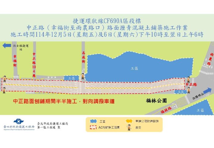 為配合捷運環狀線北環段CF690A區段標工程Y27站第2-1階段交維,捷運工程局第一區工程處將於114年12月5日起至115年3月4日將進行中正路(幸福街至雨農路口)路面刨鋪、車道及工區圍籬南移調整作業,遇雨順延或改期,相關施工範圍如附圖。 本階段施工將先進行中正路路面刨鋪作業,期間該路段將採半半施工及對向調撥車道,期程規劃說明如下: 1.中正路南側道路封閉施工:南側車道(往故宮方向)路面鋪築及圍籬移設,時間114年12月5日下午10時至翌日上午6時。 2.中正路北側道路封閉施工:北側車道(往社子方向)路面鋪築及圍籬移設,時間114年12月6日下午10時至翌日上午6時。 本次第2-1階段交維起自114年12月5日至115年3月4日止,因施工需要將車道向南側偏移1車道,並於中正路118號前(雙側)及中正-雨農路口設置漸變路段,圍籬移設完成後車道數不變(中正路120號至福林路間維持雙向各3車道)期間請用路人行經施工區域減速慢行,並依改道後之宣導牌面、遵循導引標誌及現場指揮人員導引指示減速慢行,以確保行車安全。施工期間民眾如有任何問題以及建議事項,或想瞭解最新施工動態,可隨時利用下列聯絡電話反映,將有專人竭誠為您服務與解說,施工造成暫時不便,敬請見諒。