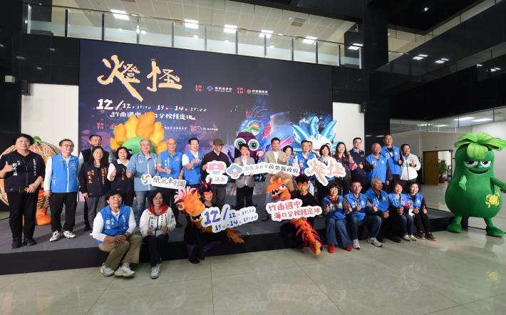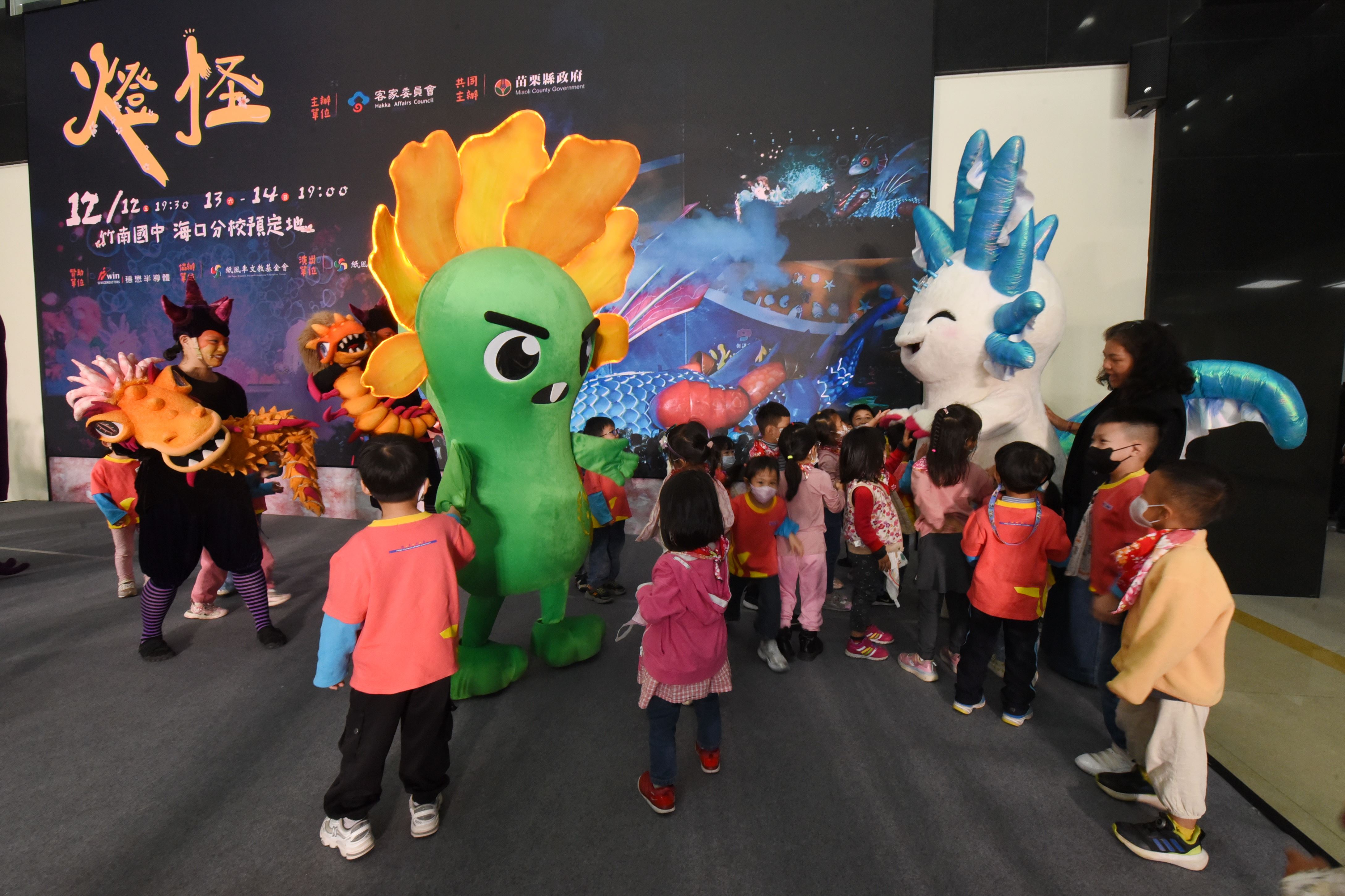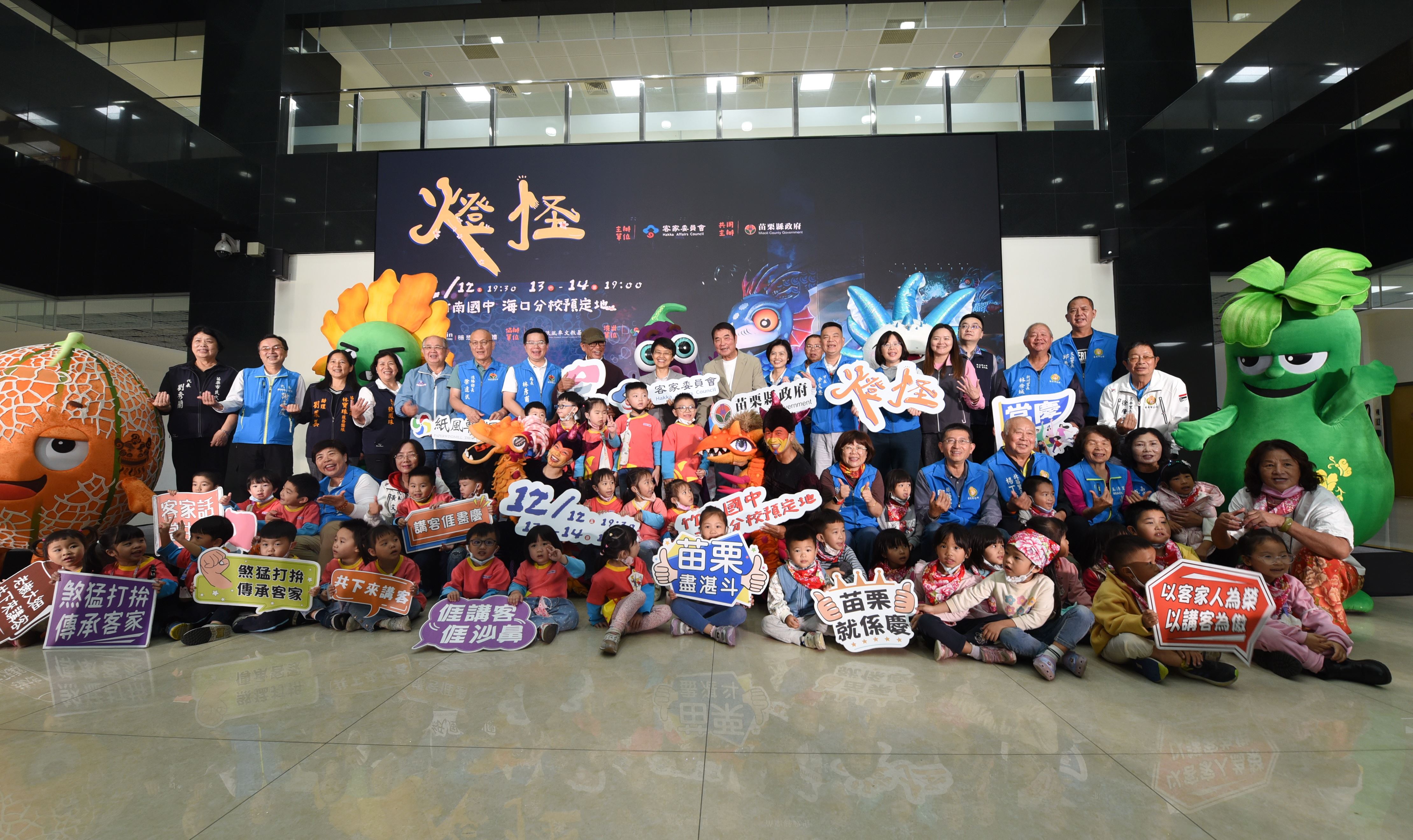 客家委員會與紙風車劇團共同籌備近2年的親子大戲《燈怪》,預定本月12至14日在竹南國中海口預定地連續演出3天,這是繼北、高兩地掀起旋風之後,第一個巡演的縣市。劇中最萌的小黃瓜與燈族人偶2日現身縣府的宣傳會場,小朋友爭相與可愛角色近距離接觸,未演先轟動!客委會主委古秀妃、縣長鍾東錦偕同來賓,歡迎鄉親觀賞震撼的「燈燈國王」和可愛的萌角色,沉浸在生動的童話故事中,快樂傳承客語。
