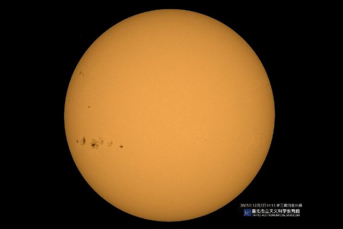 臺北天文館於12月2日捕捉到巨大的太陽黑子群影像,這個由編號AR 4294-96黑子群組成的黑子集團,是十年來所出現最大的黑子群之一,全長約18萬公里,當中至少有五個黑子的面積比地球還大。目前這個龐大的黑子群正隨著太陽自轉而逐漸朝向地球,未來一、兩週內均可觀察,臺北天文館將於開館日的上午10至12時、下午14至16時,開放專業望遠鏡讓民眾一睹這壯觀的太陽景象。