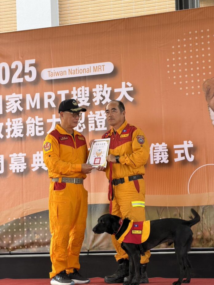 台中市政府消防局搜救犬隊再次寫下光榮紀錄!領犬員洪瑞宏與搜救犬Uno、領犬員張憲騰與搜救犬Ring兩組搭檔,在日前由內政部消防署於竹山訓練中心舉辦的「2025年國家MRT(Mission Readiness Test) 搜救犬救援能力認證活動」中,雙雙順利通過認證。這項被譽為全台最高等級、最貼近真實災害場景的搜救犬檢測,不僅驗證台中搜救犬隊的專業實力,更展現他們將是未來國際人道搜救領域中不可或缺的關鍵力量。