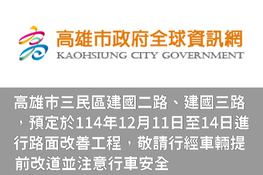 高雄市三民區建國二路、建國三路,預定於114年12月11日至14日進行路面改善工程,敬請行經車輛提前改道並注意行車安全