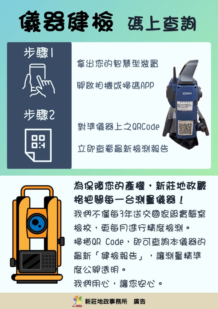 新莊地政事務所主任林圭宏表示,該所自主落實「每月簡易檢測」,於月初針對經緯儀測角、測距等項目進行全面檢查,相關檢測數據及紀錄均上傳至新北市政府地政局建置之「測量儀器電子履歷系統」。此外,為推動透明化管理,民眾及相關業務人員只需以手機掃描儀器旁張貼的QR Code,即可隨時查閱該儀器當月最新檢測結果,讓儀器狀態公開透明。