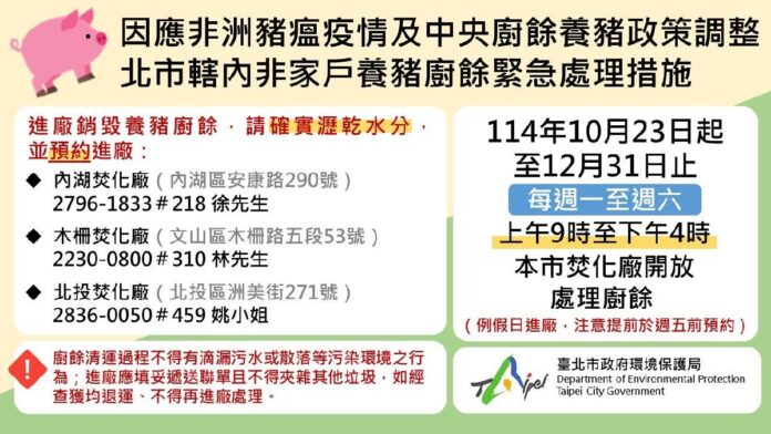 臺北市環保局今(5)日指出,行政院已公布全國廚餘政策調整方向,明定廚餘養豬全面退場機制,並提供緩衝期協助事業廚餘去化及廚餘養豬戶轉型,配合中央政策調整,臺北市三座焚化廠協助銷毀非家戶養豬廚餘原開放至12月6日止,將延長至114年12月31日止,並維持原預約機制。該局表示,進廠時間則調整為周一至周六上午9時至下午4時,期間免收代處理費。