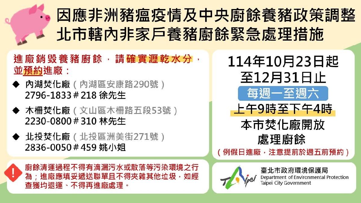 環保局表示,臺北市三座焚化廠至114年12月4日止,已協助處理非家戶養豬廚餘7,267.08公噸,後續配合中央政策延長開放進廠時間至114年12月31日止,屆期中央將不再補助相關處理費用,非家戶廚餘產源仍應依廢棄物清理法規定,確實委託合法清除、處理或再利用機構妥善處理廚餘,善盡使用者付費、污染者付費的廢棄物清理責任。