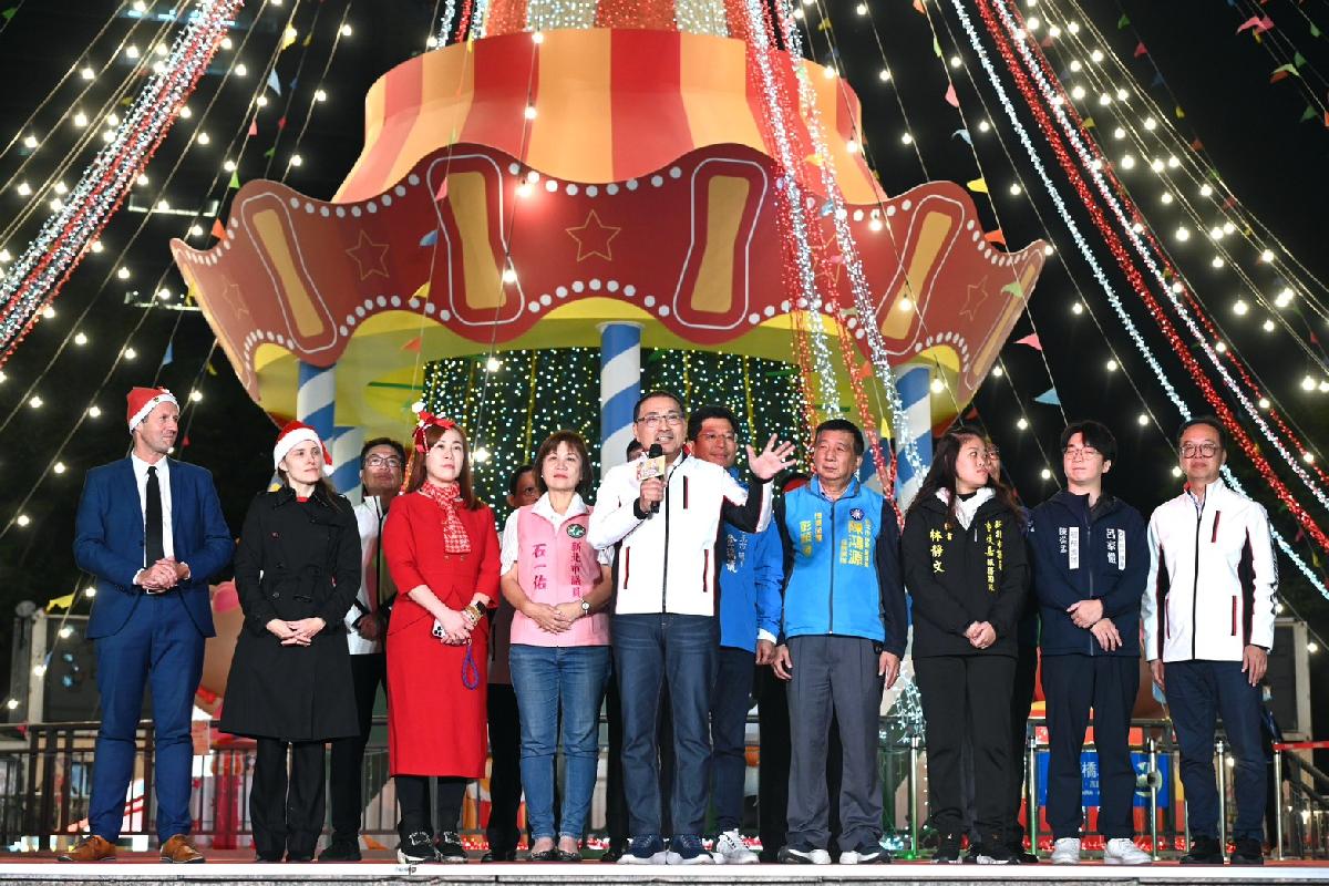 「2025新北歡樂耶誕城」今(5)晚間迎雙慶典,包括啟動主燈新秀,Freunde willkommen德國耶誕市集也開市啦!今年耶誕城以全臺唯一的夢幻馬戲主燈為亮點,開城至今已吸引超過300萬人次參與。今晚由新北市長侯友宜、德國經濟辦事處首席代表暨處長蘭依樺,以及歐洲經貿辦事處處長Lutz Güllner 谷力哲共同啟動第二支雷射光雕3D投影秀「馬戲團魔法道具篇」,大家喜愛的LINE FRIENDS人氣角色莎莉也現身同樂,帶給現場大小朋友滿滿驚喜。