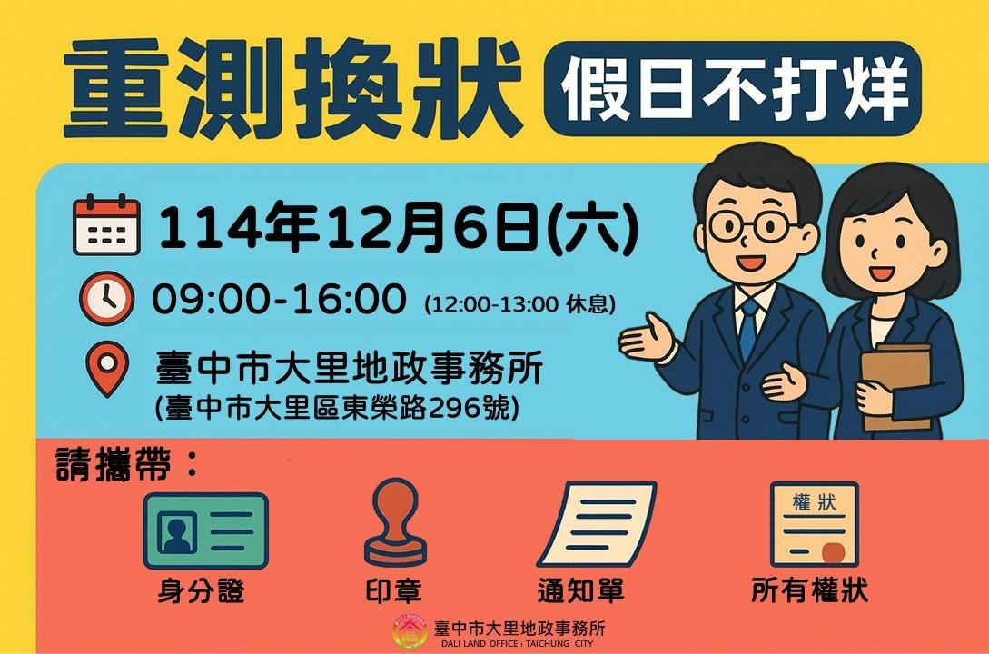 地政局說明,大里地政事務所將於12月6日(星期六)上午9時至12時、下午1時至4時開放專案假日換狀服務,並同步設置地政法令宣導及諮詢櫃檯,由專業人員現場提供解說。為配合市府反詐騙政策,現場亦可申辦「地籍異動即時通」及「指定送達處所」等服務,協助民眾提升不動產交易安全,歡迎多加利用。