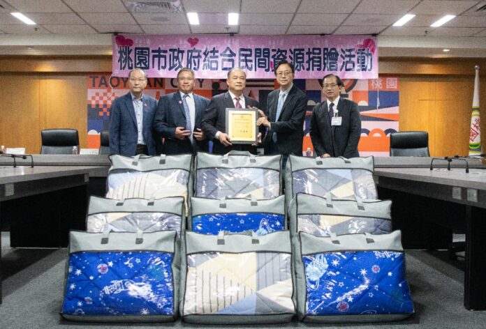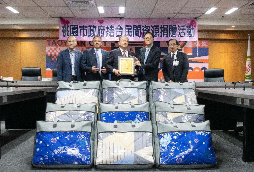 桃園市長張善政今(12)日下午於市府,出席「財團法人桃園市世外桃源文教公益基金會農曆春節棉被捐贈儀式」,並回贈感謝狀表彰企業善舉。張市長表示,感謝世外桃源文教公益基金會、桃園企業聯合會及金色年代等單位,自107年起即陸續捐贈月餅禮盒、電扇、清潔用品組、發熱衣、物資包等,此次更捐贈市值約70萬元的953件雙人保暖被,將透過桃園市安家實物銀行寒冬送暖,讓桃園弱勢家戶溫暖迎新年。