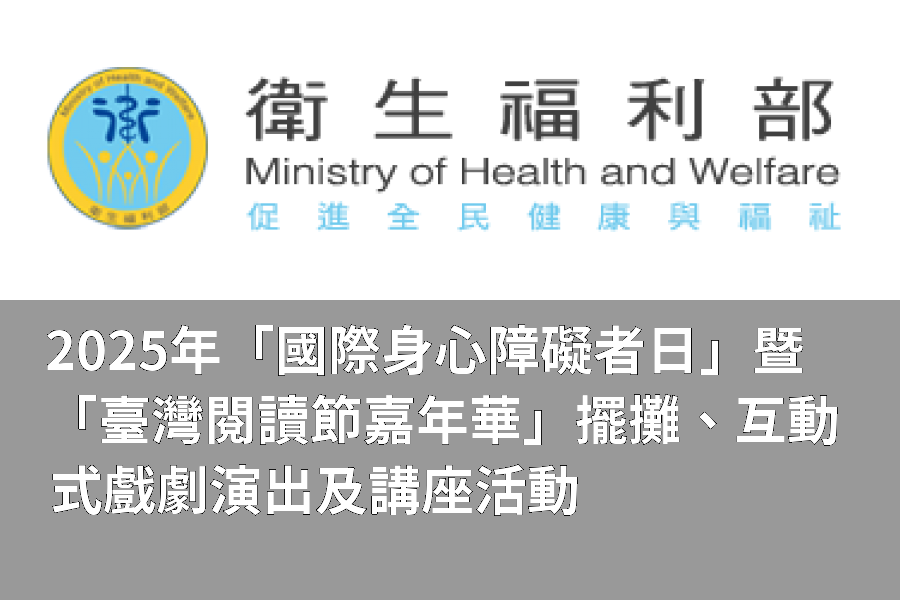 為響應2025年12月3日國際身心障礙者日,衛生福利部社會及家庭署(下稱衛福部社家署)以「CRPD 大家一起來參與!」為主題,參加12月6日(星期六)及12月7日(星期日)於中正紀念堂盛大舉行之「臺灣閱讀節」擺攤活動,現場有國際圖書館、駐台辦事處、全國公共圖書館、政府機關、出版社及民間團體一同設攤,邀請大家來一起動動腦、動動手,一起讀好書、玩闖關遊戲、聽演講、看好劇!