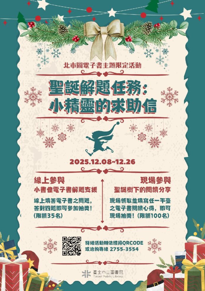 臺北市立圖書館總館「聖誕解題任務:小精靈的求助信」限定活動於12月8日至12月26日舉辦,民眾可透過圖書館電子書平臺,線上查找聖誕故事繪本與文學小說獲得解答,鼓勵民眾多加利用圖書館豐富資源,故事內容包含尋找友情、禮物心意、與人分享、學習正確的金錢觀、培養同情心與家庭合作等主題。跟著故事找線索,完成聖誕小精靈的升等考驗吧!