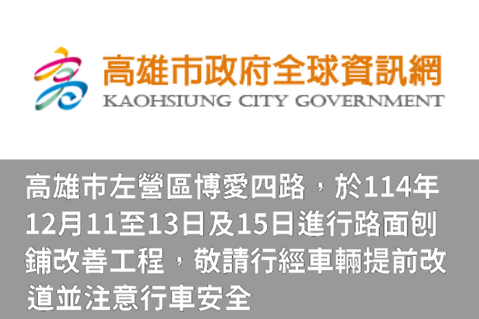 為改善高雄市道路通行品質,工務局道路養護工程處將於12月11至13日及15日進行左營區博愛四路(重和路至華夏路)路面刨鋪工程,施工時段為上午8時至晚間8時,另為顧及工程品質,刨鋪後均依施工規範封閉養護6小時以上或溫度降低至50°C以下始開放通車,確保道路使用壽命及品質,如遇天候不佳,將順延一天進場施工。