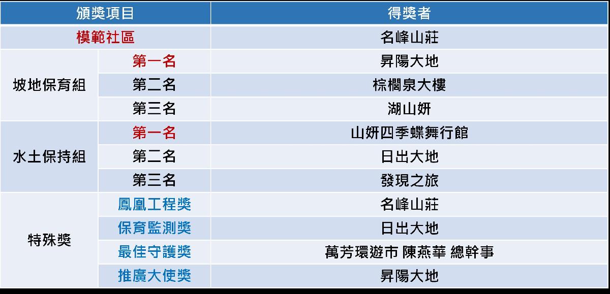大地處坡地住宅科葉瀚仁科長表示,今年優良社區選拔經由18處坡地社區齊聚較勁,經過專家審查後脫穎而出得獎名單如下:水土保持組由內湖區山妍四季蝶舞行館拿下第一、文山區日出大地第二名、文山區發現之旅第三名;坡地保育組則由內湖區昇陽大地奪冠、北投區棕櫚泉第二名、內湖區湖山妍第三名;除此之外,也頒出各類特別獎「模範社區」及「鳳凰工程獎」北投名峰山莊;「保育監測獎」文山區日出大地;「最佳守護獎」文山區萬芳環遊市陳燕華總幹事;「推廣大使獎」內湖區昇陽大地。