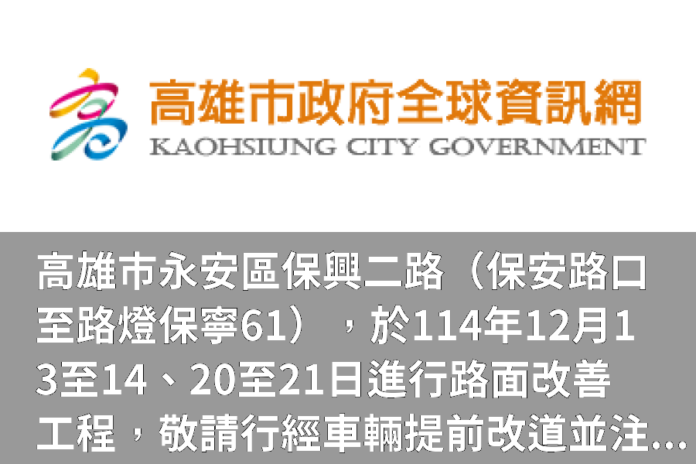 高雄市永安區保興二路(保安路口至路燈保寧61),於114年12月13至14、20至21日進行路面改善工程,敬請行經車輛提前改道並注意行車安全