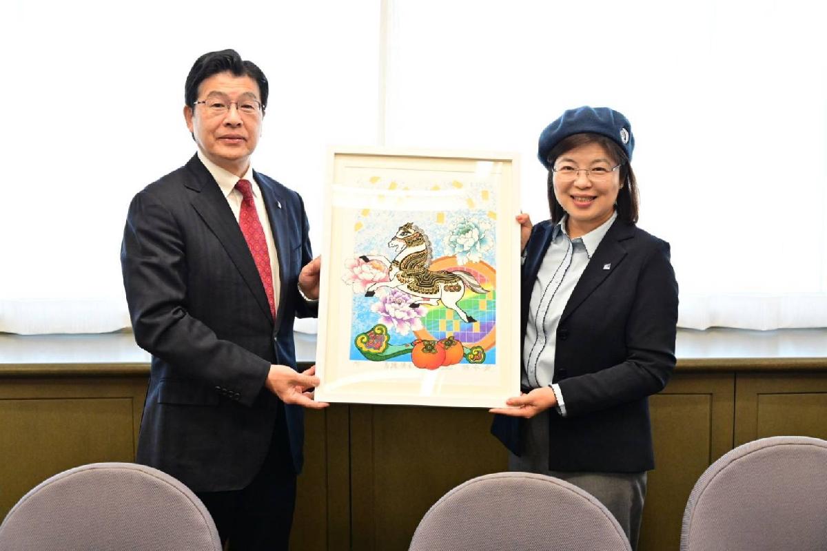 為深化國際文化鏈結,新竹縣政府秘書長李安妤率團前往東京都墨田區政府拜會,並與區長山本亨及其團隊就文化、工藝與觀光合作進行深入交流,到訪時特別將「竹縣之光」版畫家陳永欽的年畫作品《馬躍揚名畫》致贈墨田區政府,象徵新竹縣文化藝術跨海傳遞,並深化台日兩地情誼。